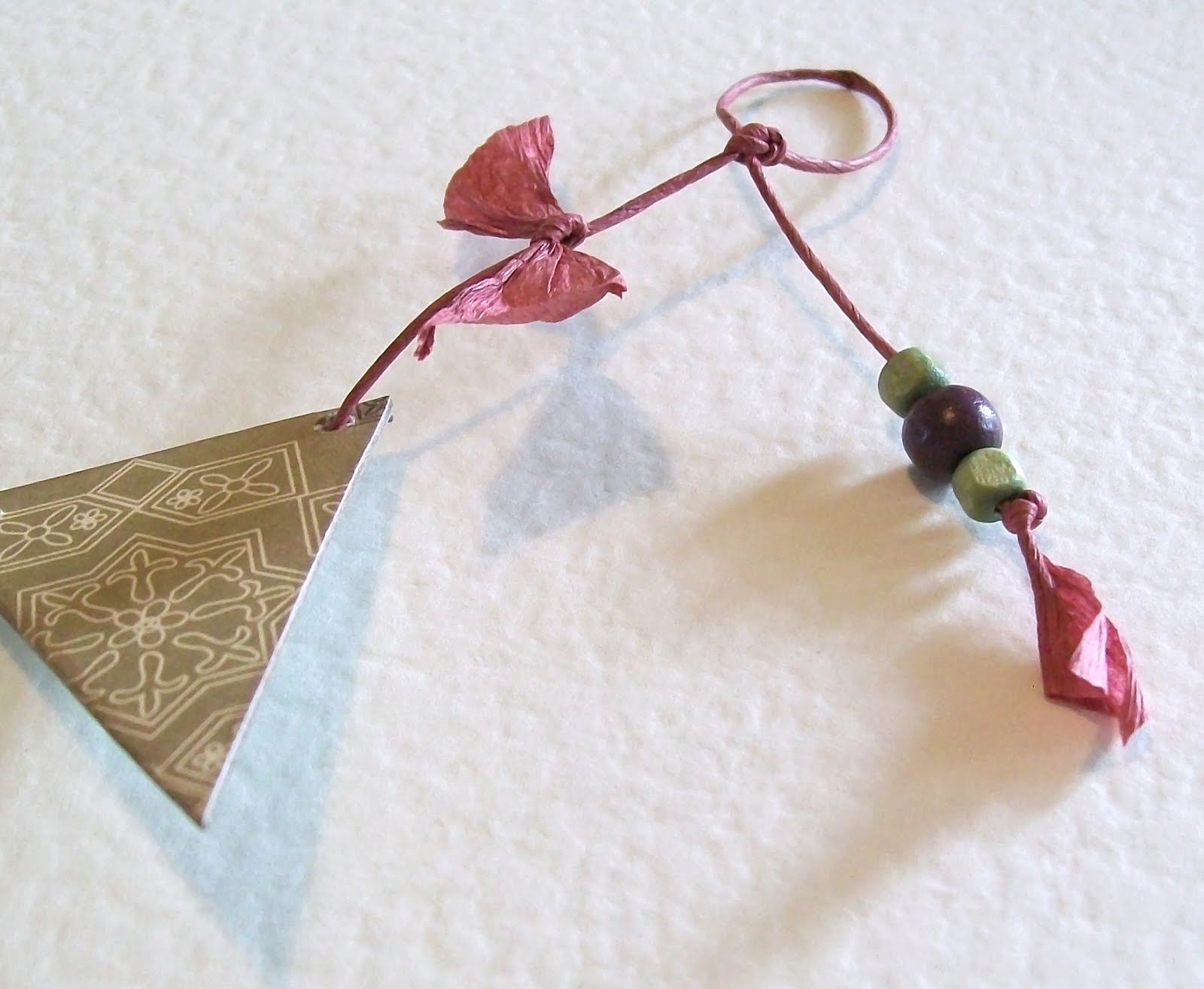 The ends are finished with a knot of paper ribbon, a hanging loop and three small wooden beads in plum and green.